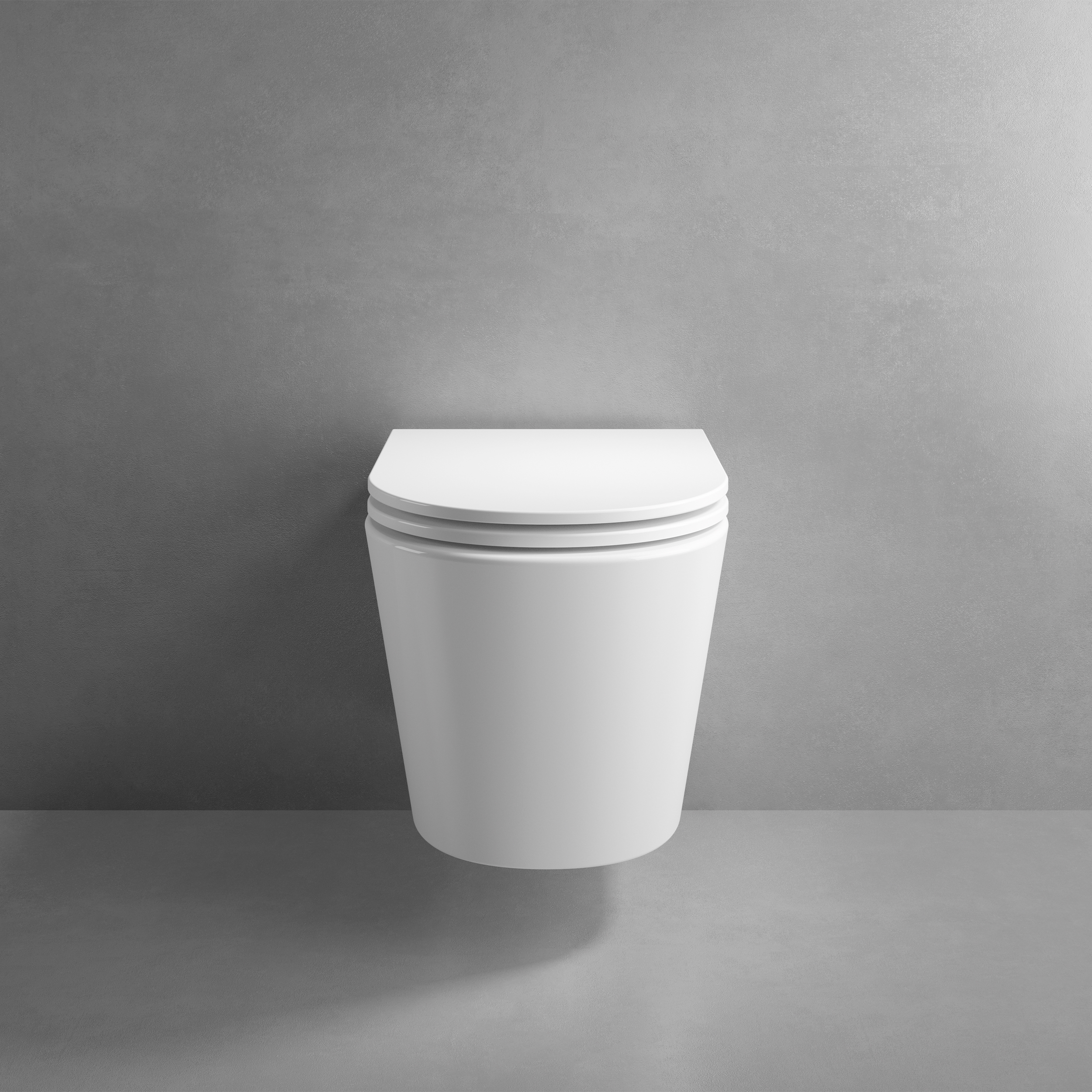 Inodoro suspendido Aquitania, con salida horizontal, Rimless, tapa amortiguada y sistema Clip Off.