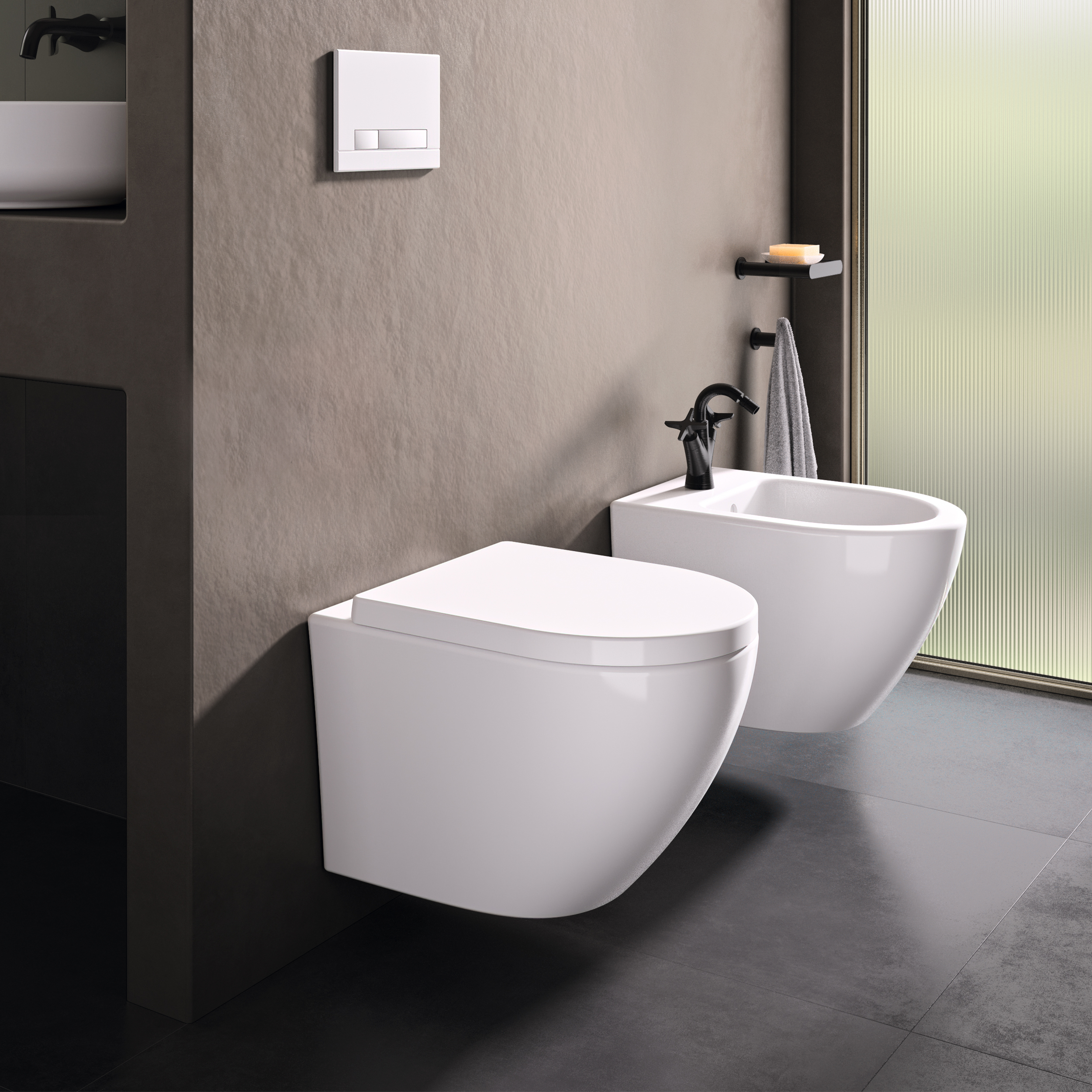 Inodoro suspendido Doria con salida horizontal, Rimless, tapa amortiguada y sistema Clip Off.