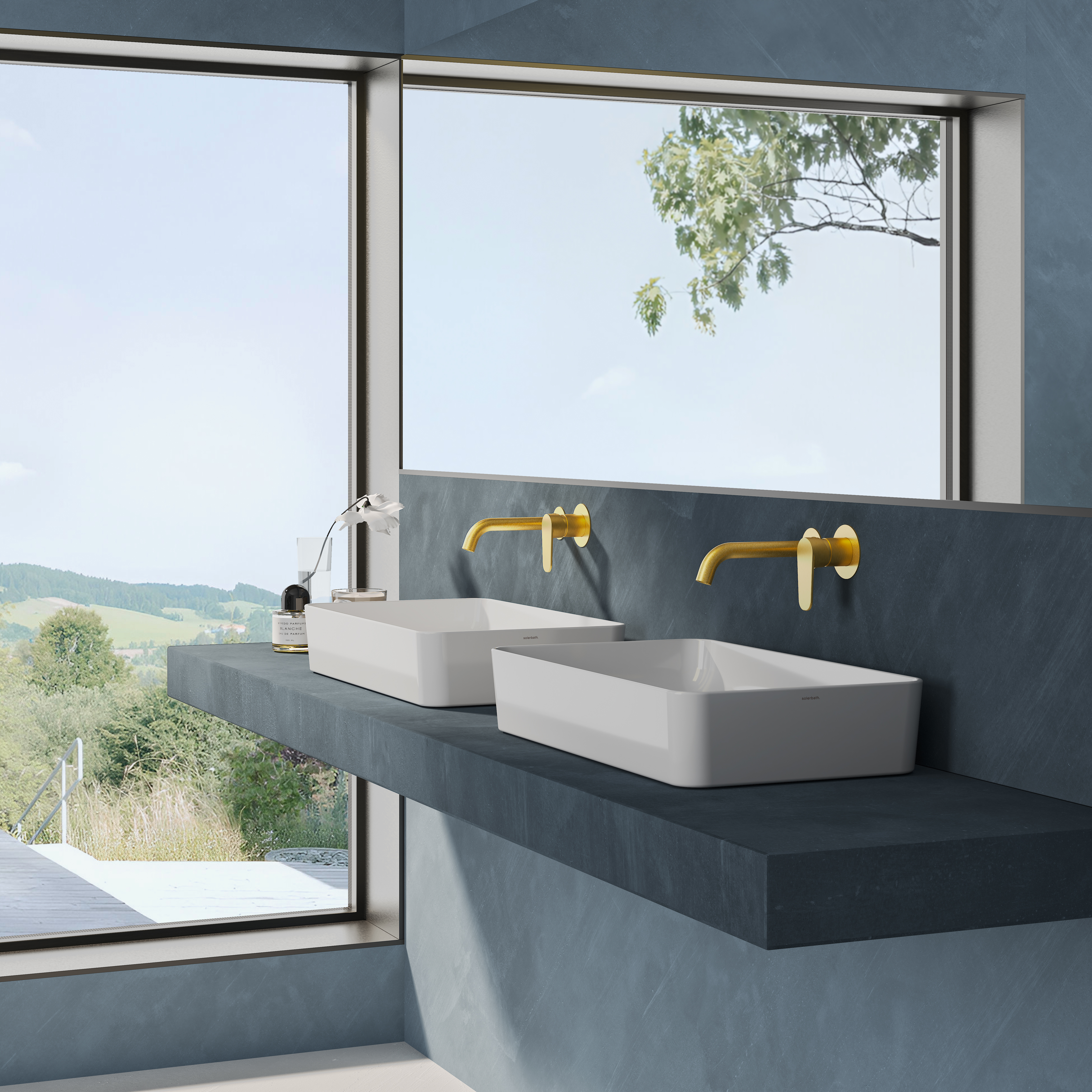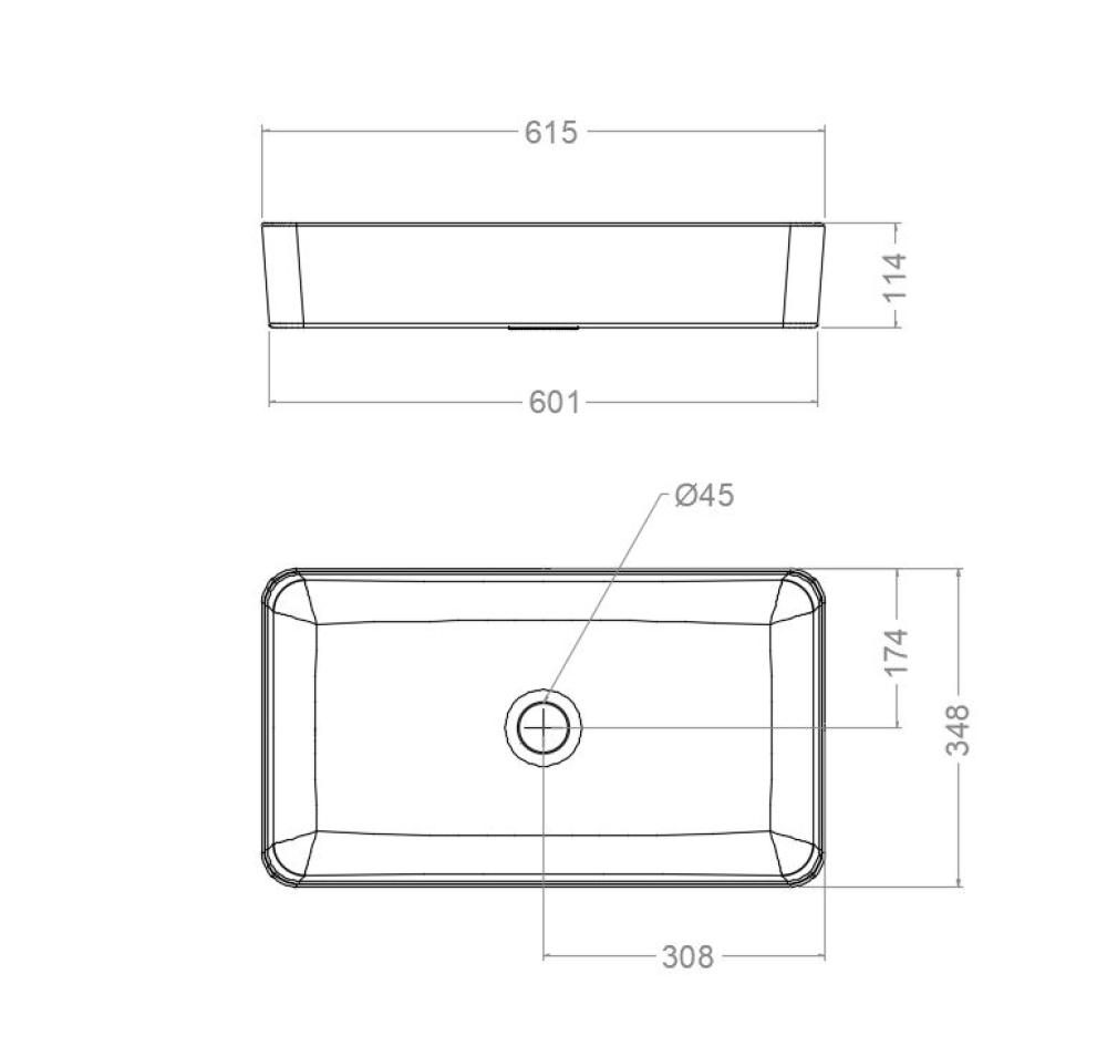 Lavabo blanco rectangular Kaiser sobre encimera. Sin rebosadero y sin orificio de grifería.